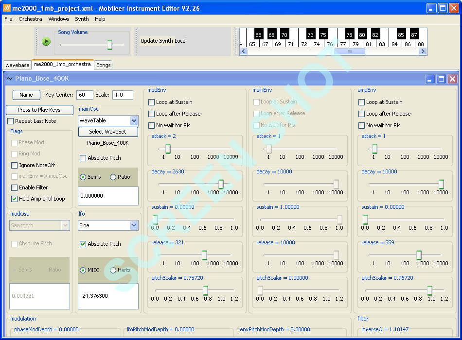 The Orchestra Editor enables the user to manipulate notes in pitch, modulation, looping, and filtering. It allows the user to create different envelopes with specific instructions |